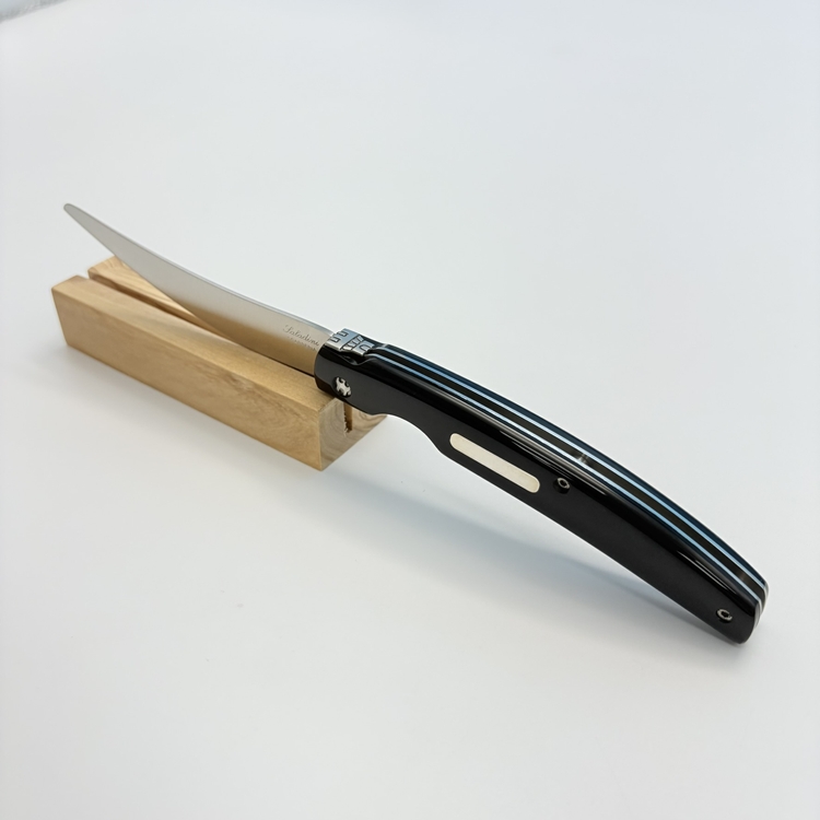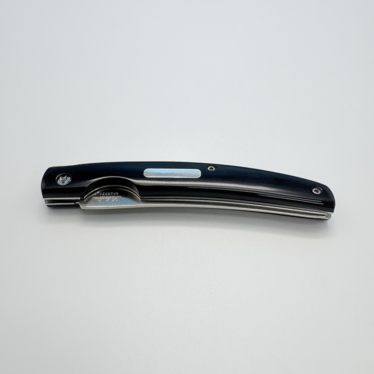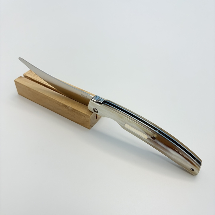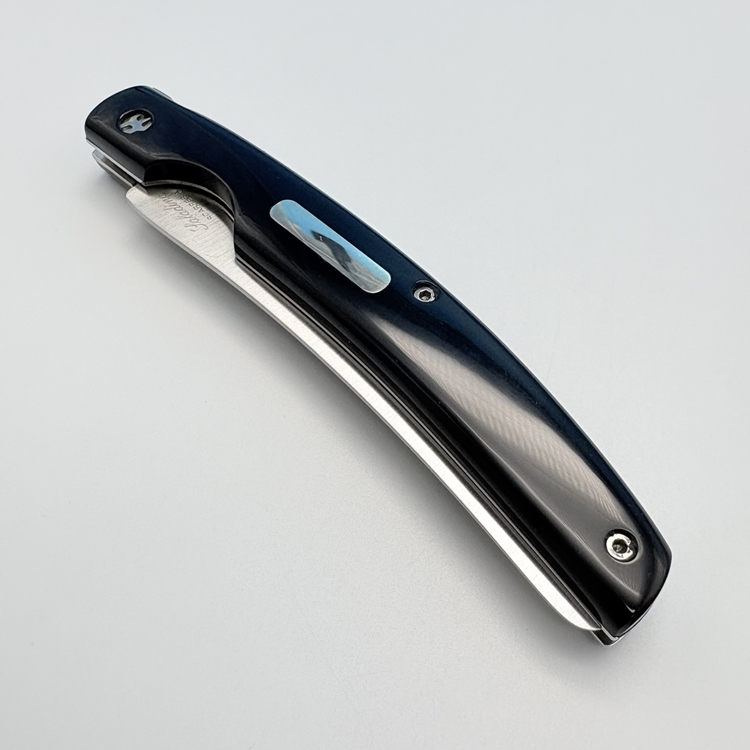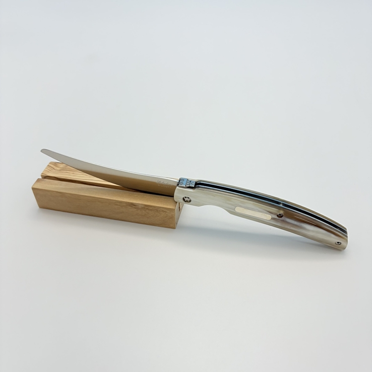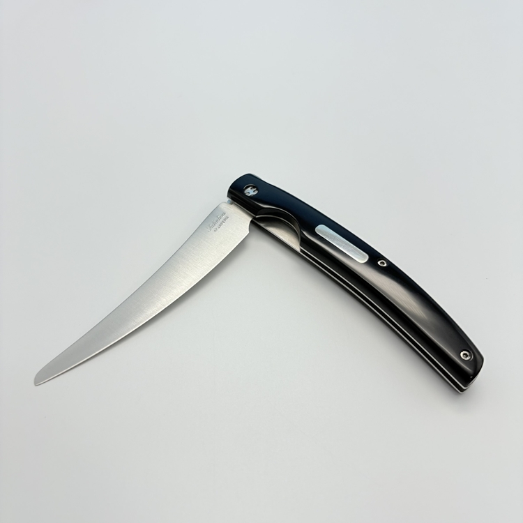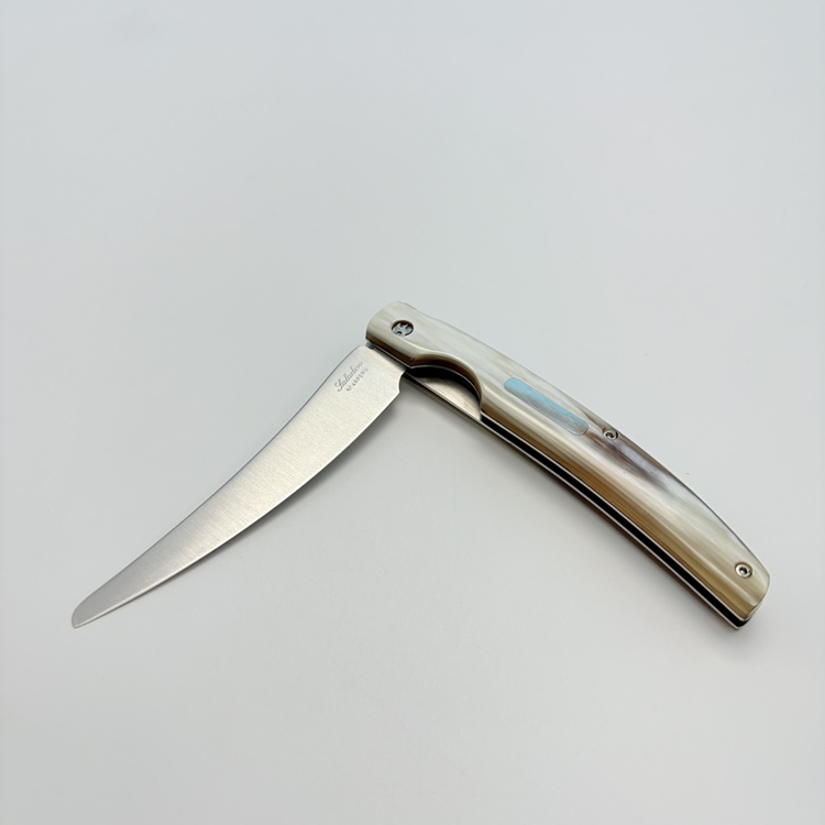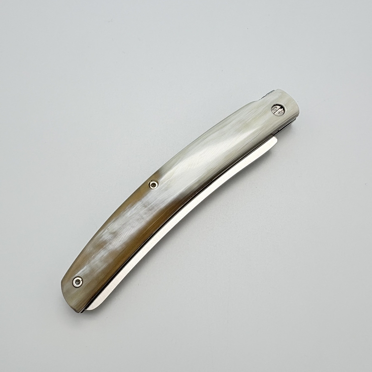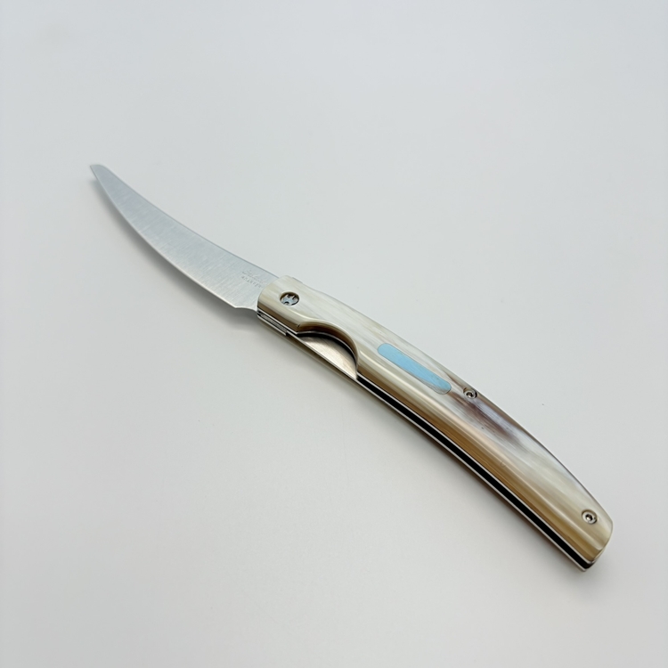 刀刃採用 不鏽鋼 UGINOX MA5MV(1.4116,硬度 HRC56–58) 製成,表面為霧面處理;刀柄貼片使用 水牛角白牛角及橄欖木三款,質感沉穩細緻。